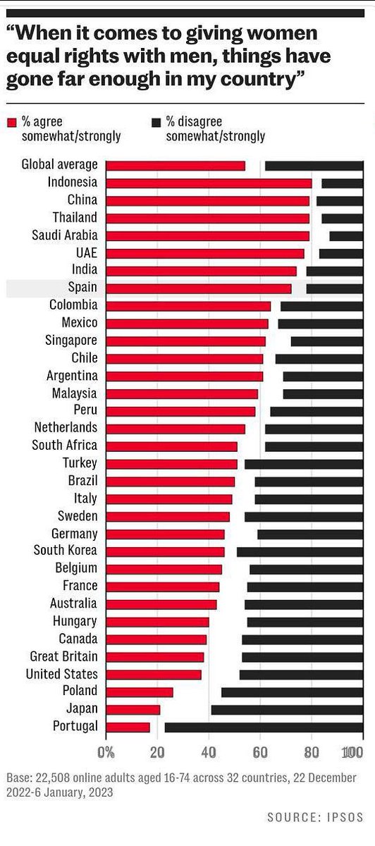 哪些国家觉得“男女平等在我的国家已经走的足够远了”的人最多,中国,沙特,阿联酋都接近80%,自我感觉良好,有的实践排名比较低也很有自知之明的比如日本,有实践排名较高但“感觉”排名较低的如若干西欧国家 https://t.co/8kw7VcBr2o