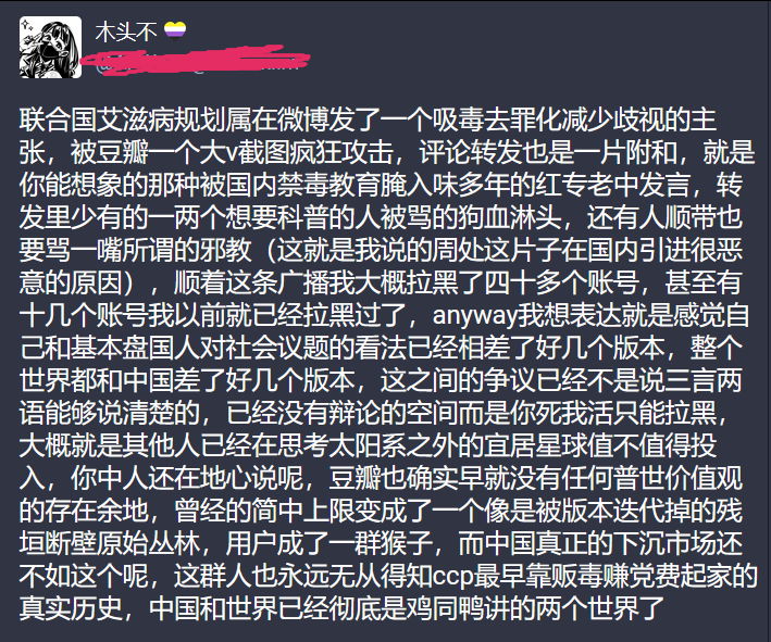 联合国艾滋病规划属在微博发了一个吸毒去罪化减少歧视的主张,被豆瓣一个大v截图疯狂攻击,评论转发也是一片附和,就是你能想象的那种被国内禁毒教育腌入味多年的红专老中发言,转发里少有的一两个想要科普的人被骂的狗血淋头......中国和世界已经彻底是鸡同鸭讲的两个世界了 https://t.co/xEzOsMc7BP
