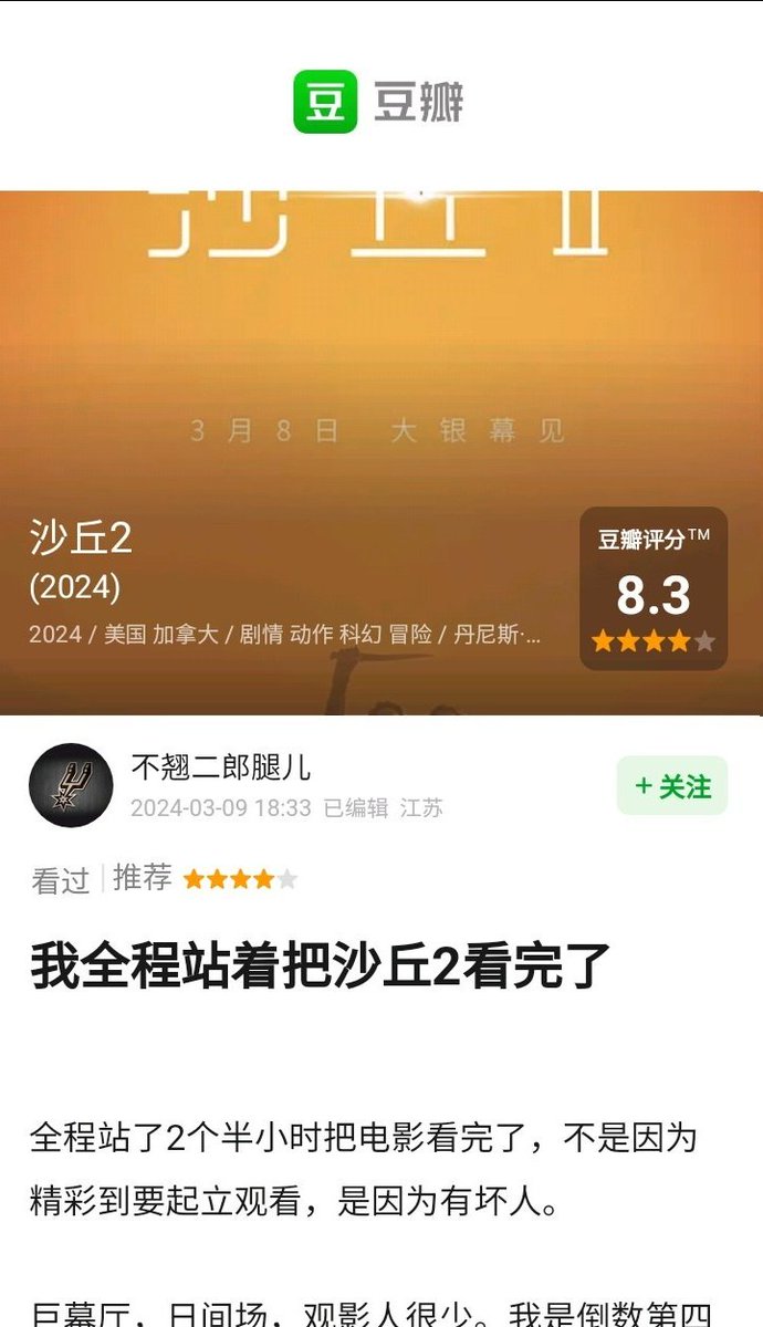 豆瓣热帖,我全程站着把沙丘2看完了,英雄。