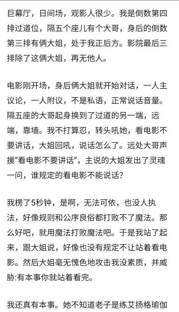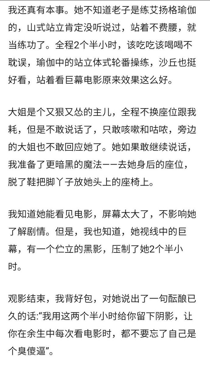 【网评】我干过一个类似的,后排闪光灯屏摄+大声说话,还不讲理辱骂,我确认后排只有他们的情况下(全场也就我和他们),打开手机闪光灯举起来直接朝后对着他们。 https://t.co/U1bpNzcS3B