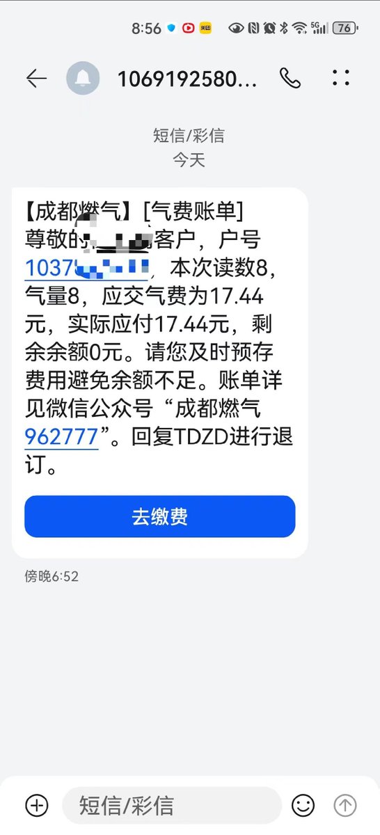成都燃气给空置了好几年的毛坯房业主发催费短信,而这套房子的燃气表都还没启用😅 https://t.co/QpawqMAdi8