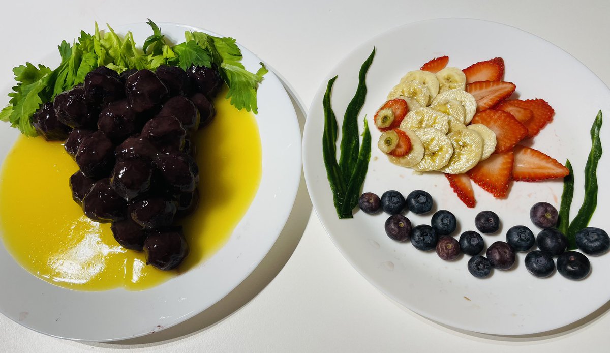 于是她趁着雅兴,还自创了两道冷盘色拉!这会不会过分惊艳了?让人都不好意思下口啊!😋