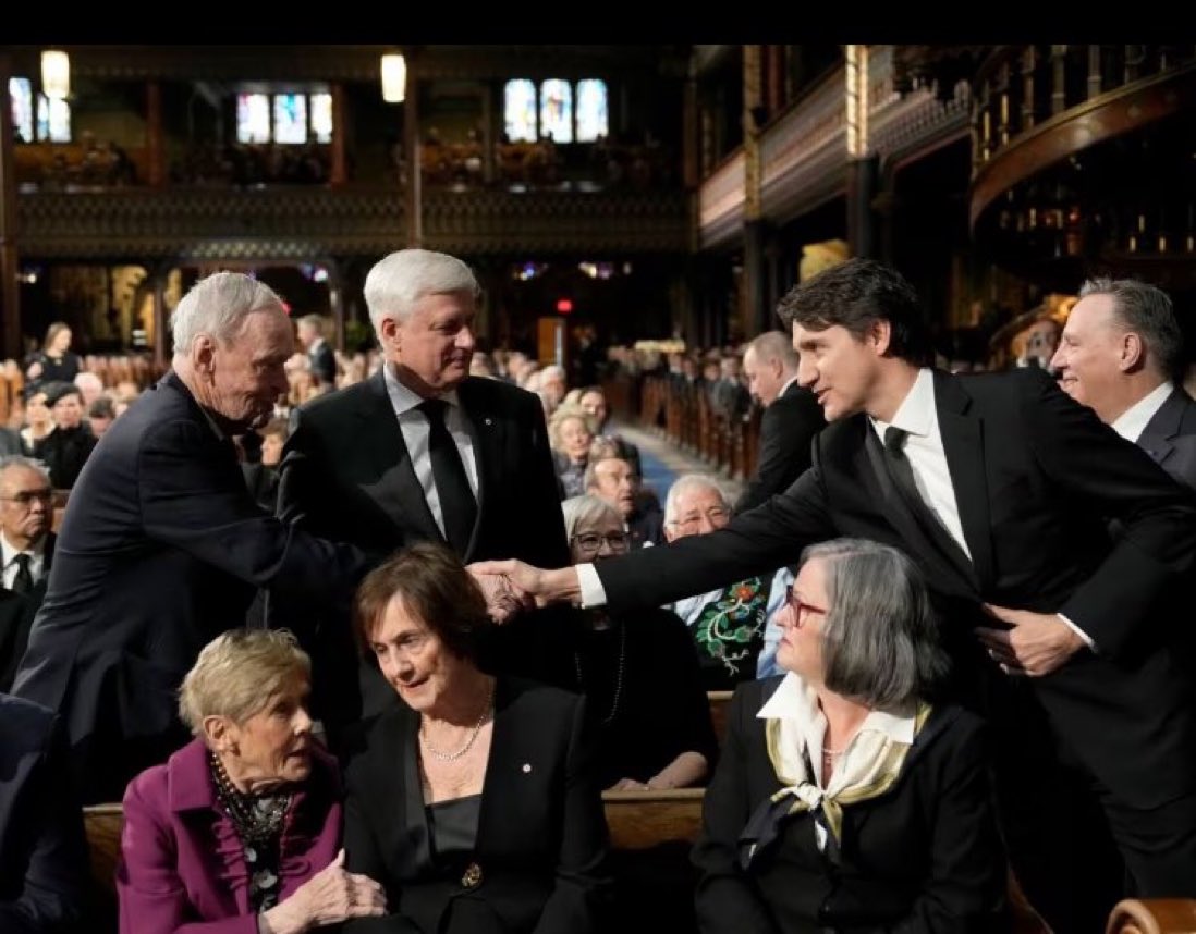 在前总理 Brian Mulroney 的葬礼上,三位健在的加拿大🇨🇦总理在握手。