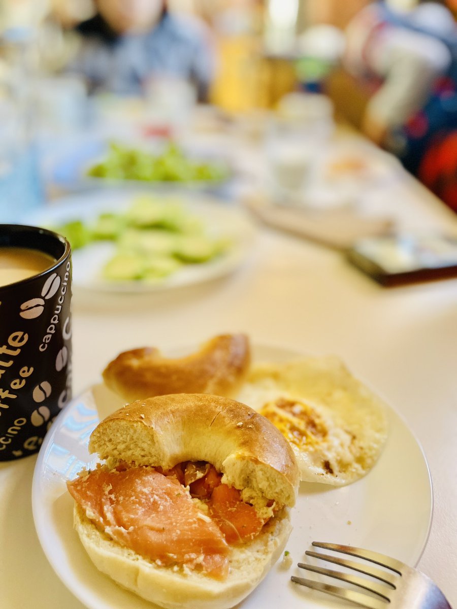 这次是女儿准备的烤白吉饼🥯Bagel+熏三文鱼和煎鸡蛋🍳……😄