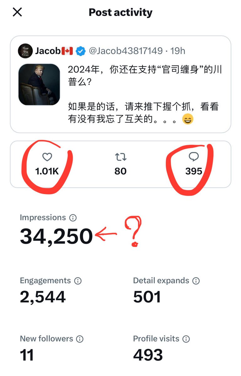 最近 X 的算法有点诡异了:通常像这种规模的推文的 Impressions 应该比这十倍都不止的。。。之前类似的推文上百万的Impression也出现过。