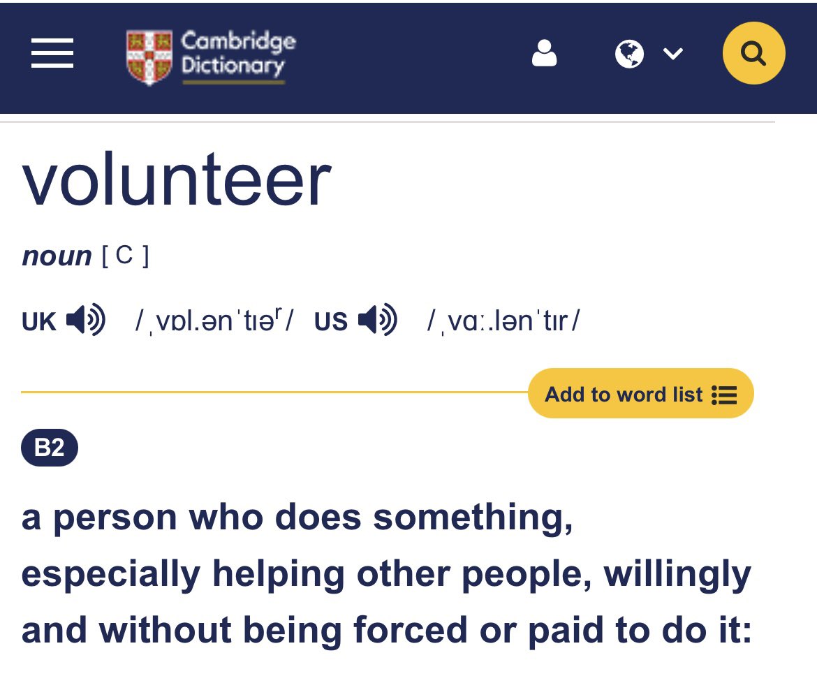 我看她俩都有点不解地看着我,就解释说:你看,志愿者- Volunteer 这个拉丁字根,本身就是基于意愿与选择(willing or of one's own choice),一旦强制就变成了 Mandate,就失去了“自愿”的意义不是么?