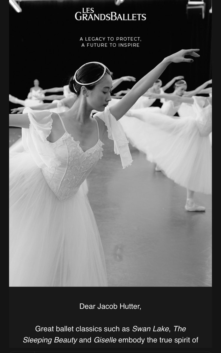 收到蒙特利尔大芭蕾舞团的 News Letter,说感谢您的支持,为了继续将《天鹅湖》、《睡美人》、《吉赛尔》等真正体现古典芭蕾精神的经典作品带给更多的观众,又到了慷慨解囊的时候了。😅