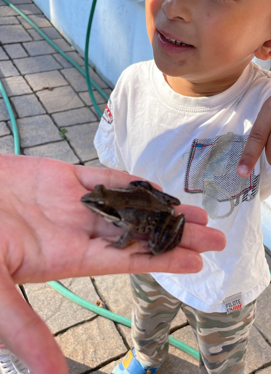 暴雨过后的泳池里来了一位小小的不速之客。。。孩子们玩了一阵子就把它放回了草丛。😅