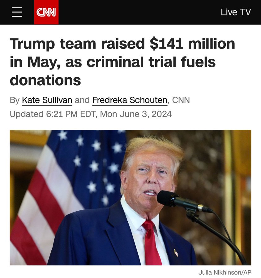 不过别忘了,自从五月被法庭构陷以来,川普团队已经筹集了超过一亿四千万美元的资金!😄