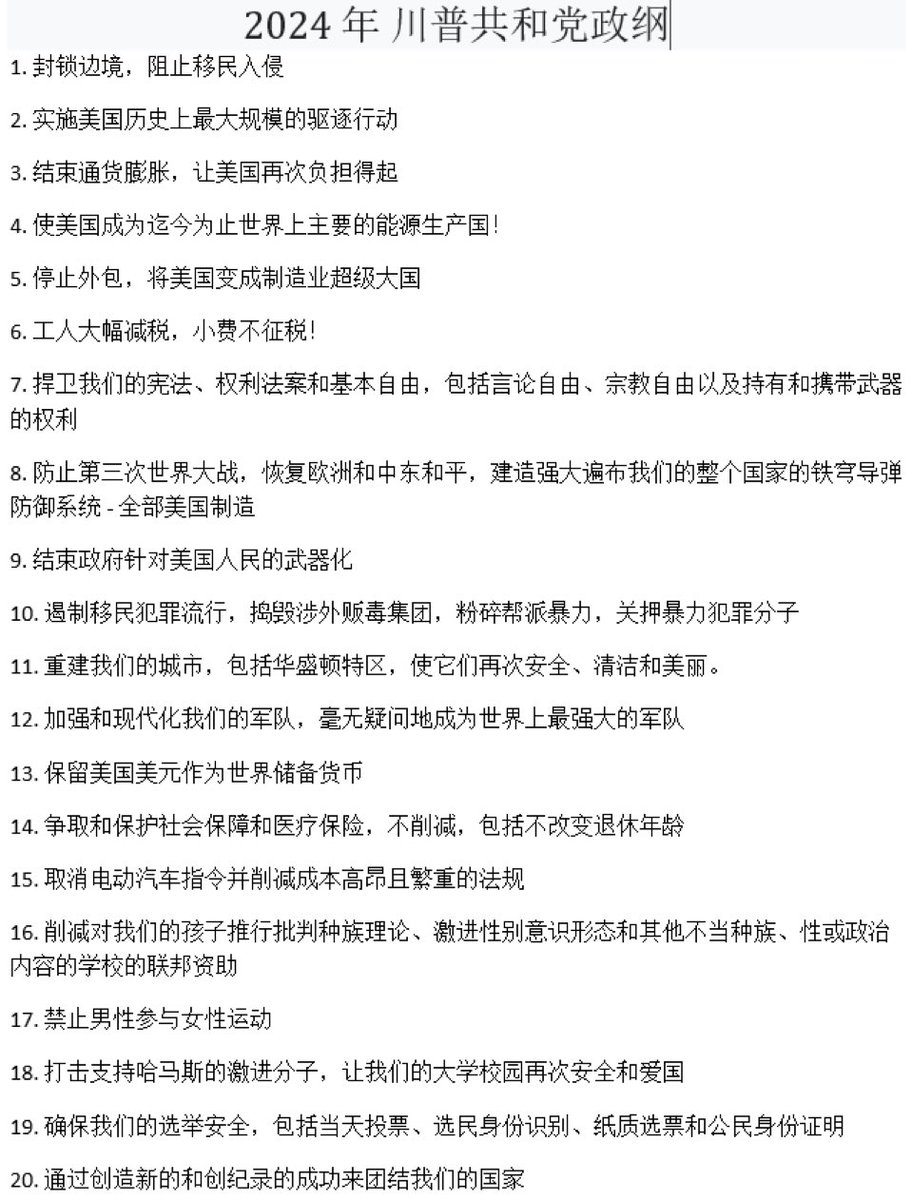 7月8日,美國共和黨公布经川普认可的“2024黨綱草案”,相較於2020年的版本,最新黨綱草案外交篇幅較少,顯示出重內政輕外交的趨勢,並以「回到一般常識」簡單化條列文字說明,具體政策包括:打擊通膨、提振美國經濟、封鎖邊界以阻止移民入侵、終結極端左翼帶來的混亂、反對晚期墮胎等。