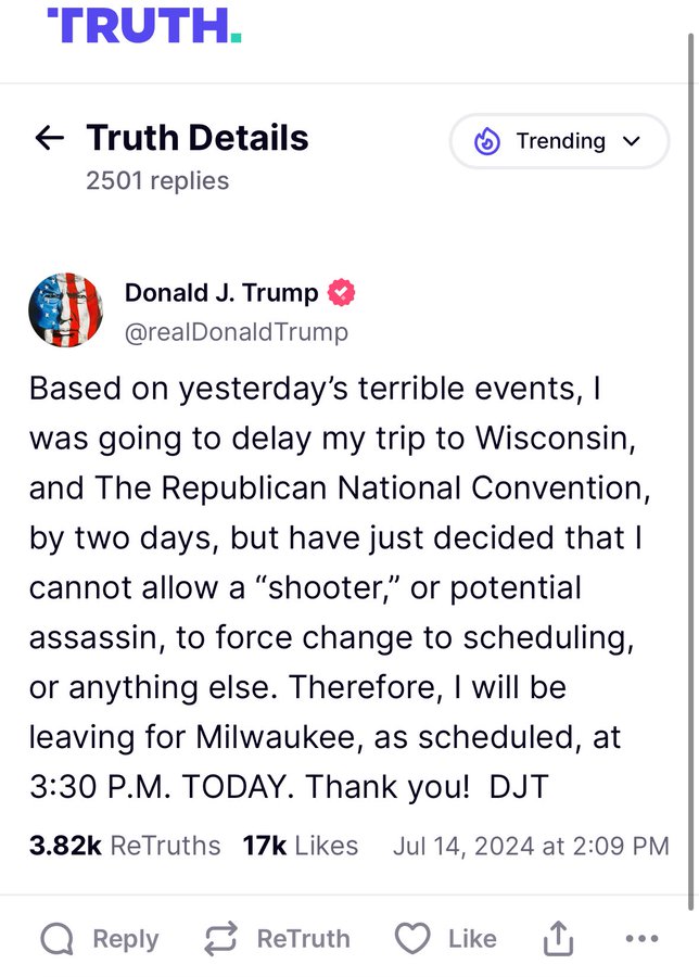 经过暗杀事件,川普本打算推迟前往原定于16日的共和党全国大会RNC,但他转念一想: