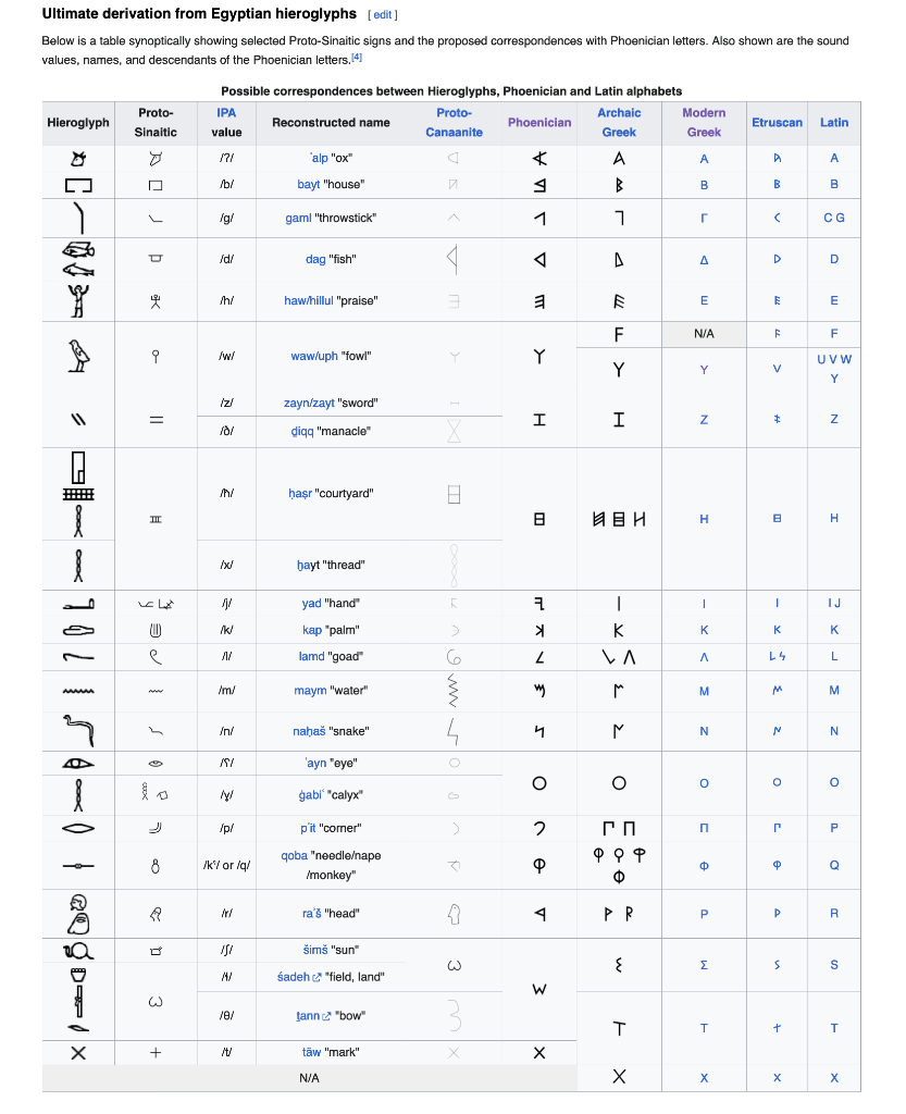 Super cool chart showing the theorized progression of how Ancient Egyptian hieroglyphs evolved step by step into each letter of the Latin alphabet we use today