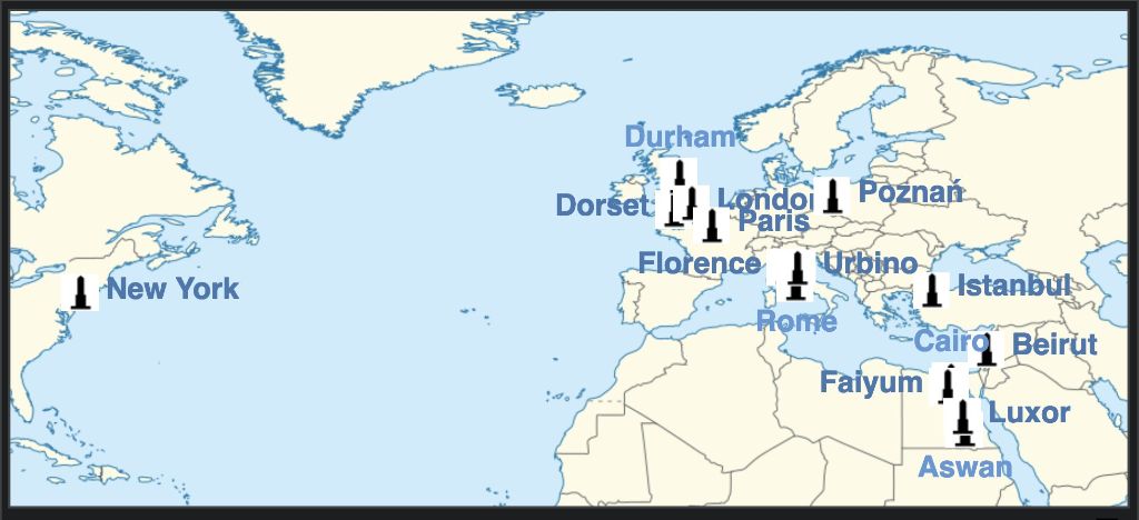 The present day locations of Ancient Egyptian obelisks that are still standing