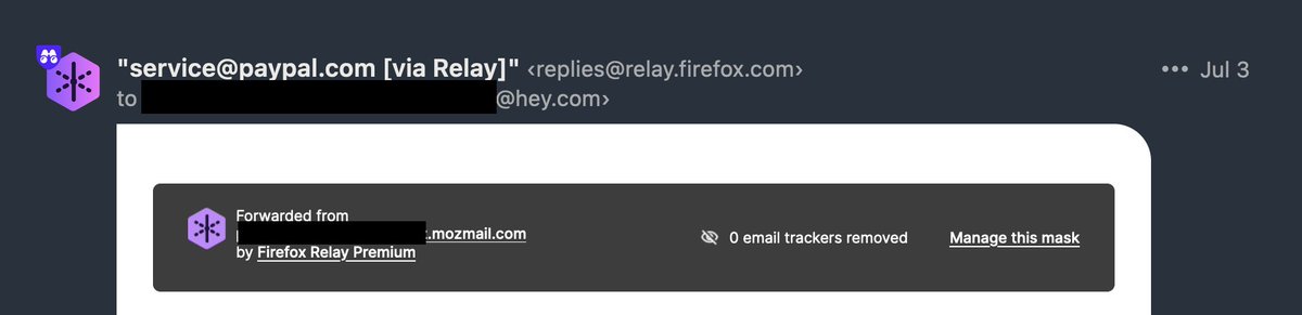 @37signals Would be super useful for @heyhey to be able to generate masked emails similar to Firefox Relay. What would give it a leg up on Firefox Relay is deeper integration into Hey, so emails sent to masks don't appear to all come from "_____@relay.firefox.com" for example