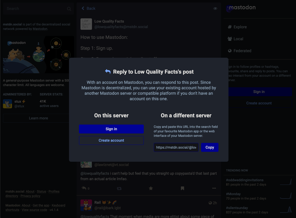 There's plenty they exaggerate, but let's be real here. If someone sends a link to your post and the average user opens it up and sees this when they try to reply... I'm sorry but Mastodon has some garbage UX that make it obvious it was designed by/for developers who have no idea what an intuitive UX is.
