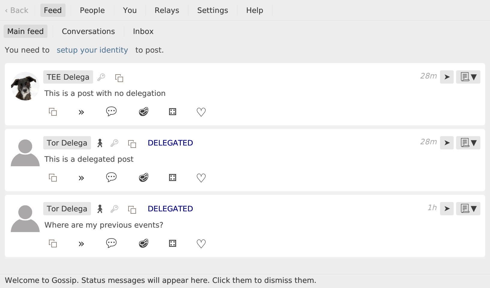 Gossip may be the first client to show as author the delegator for NIP-26 events!