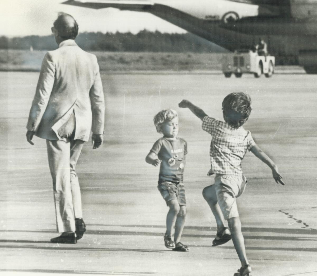 Prime Minister Pierre Trudeau walks away from Queen Elizabeth II's plane on Aug. 5, 1978. Three-year-old Sacha stands behind him, while future Prime Minister Justin Trudeau marches towards his father.