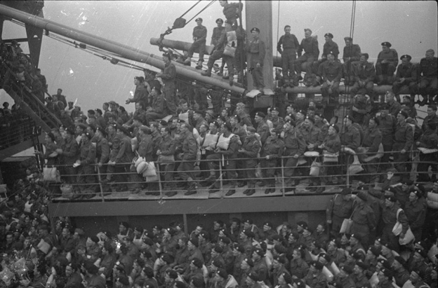 Canadian soldiers aboard a troopship arrive at Greenock, Scotland on Aug. 31, 1942.