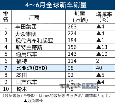 【比亞迪4~6月銷量超過了本田和日産】比亞迪銷量98萬輛,與上年同期相比增加40%,躍居世界第7,海外銷量增長約3倍,達到10.5萬輛,起到拉動作用。排名在比亞迪前面的日本車企只有豐田。對於處於劣勢的日本企業來説,今後北美市場的重要性增加……