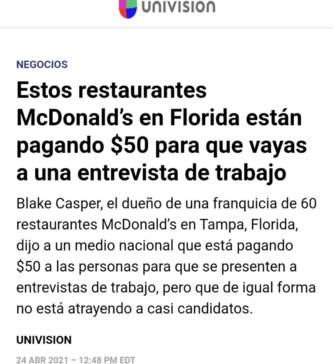 Es nuestro momento, chicos. Estos restaurantes McDonald’s en Florida están pagando $50 para que vayas a una entrevista de trabajo. Fuente: