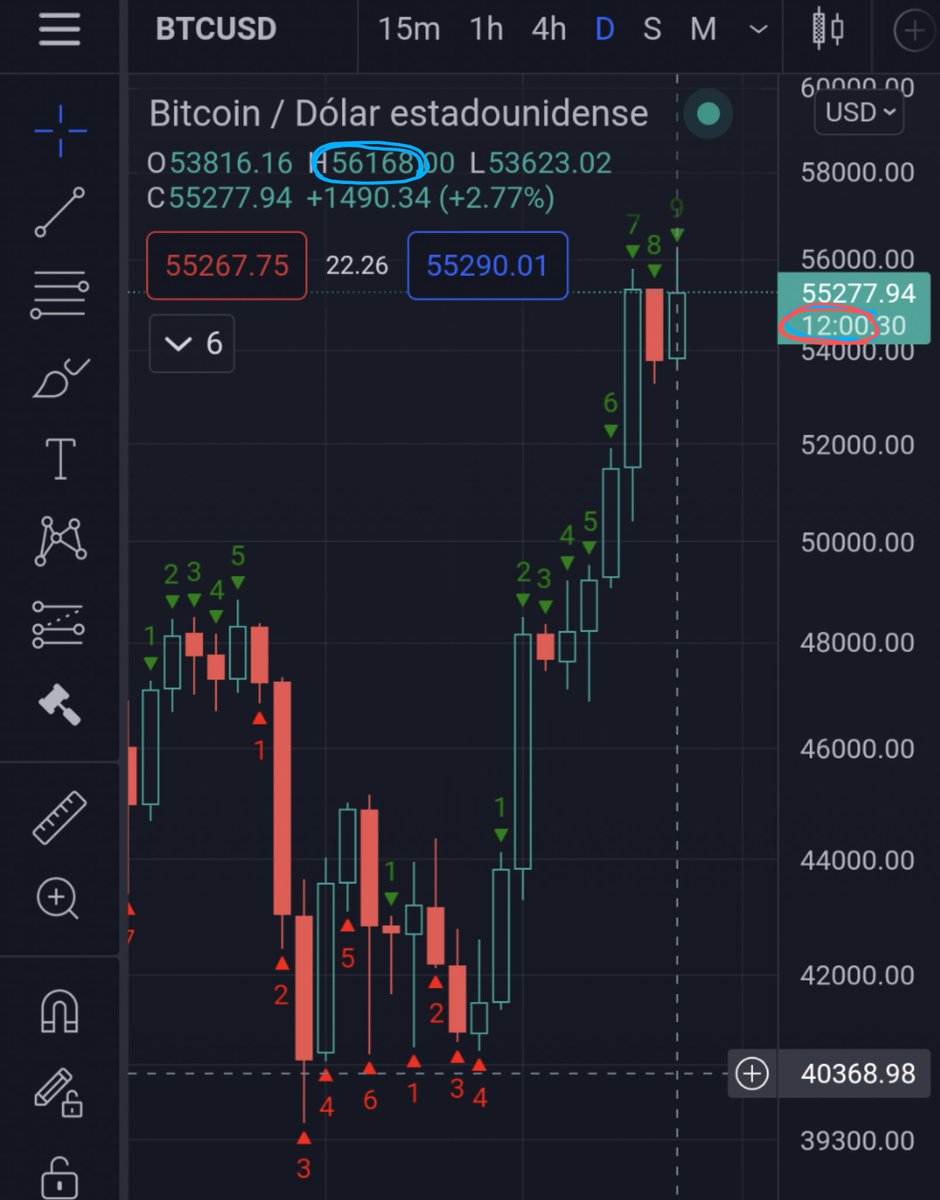 Bitcoin toca 56 mil con un 9 en el diario. Dentro de 12 horas posible retroceso de uno a cuatro días (no uno, no cuatro, sino POSIBLE momentum se calma o cambio de tendencia, d uno a cuatro días) #zoitreider #zoijamzter #zoi🐹 #diosplaca.Compra siempre. No deberías hacer trading
