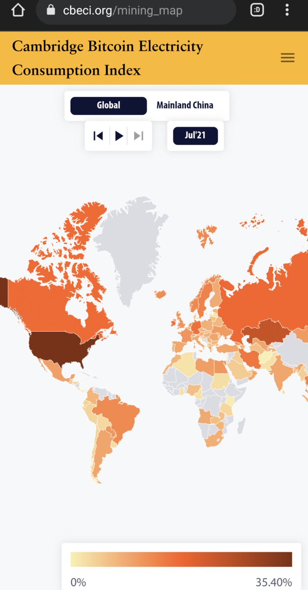 Según Cambridge Bitcoin Electricity Consumption Index (https://t.co/SIC3uy9P1w) USA es ahora (julio 2021) el epicentro de la minería de bitcoin con 35,4% del global hash rate (doble d lo q tenían en abril, cuando China tenía 44% y ahora casi cero).