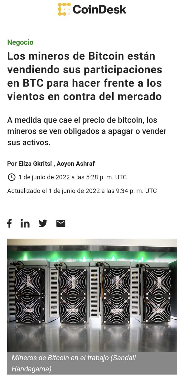 A medida que cae el precio de bitcoin, los mineros se ven obligados a apagar o vender sus activos. Fuente https://t.co/GEZnUi60VJ