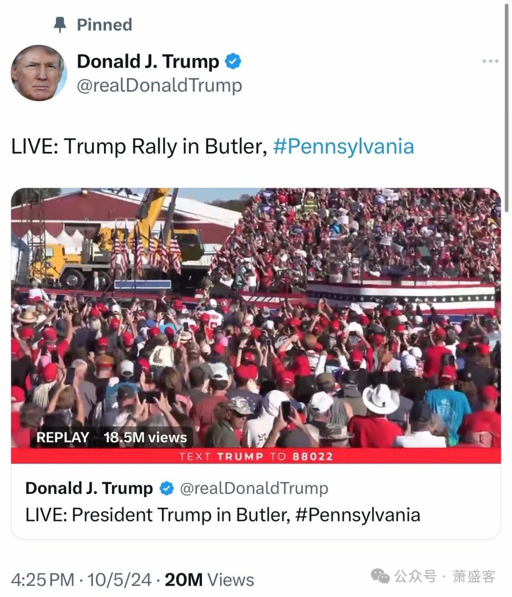 截此发此文稿前,川普在宾州巴特勒的竞选集会的实况直播在X平台上的收看记录已经高达18.5百万人!感谢马斯克提供的X平台!