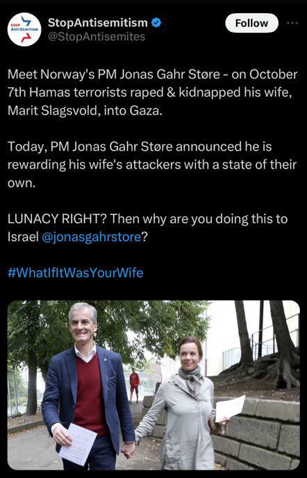 Apparently that lie stop antisemitism made about the Irish PM was also reciprocated about the Norwegian PM and likely will about the Spanish government as well, since evidently lying about child rape is how Jews "get back" at people for not wanting them to commit genocide