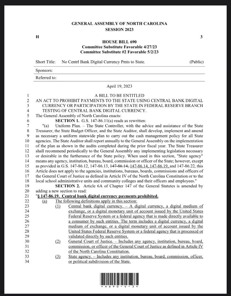 North Carolina passes bill in the house banning the state from accepting CBDCs.