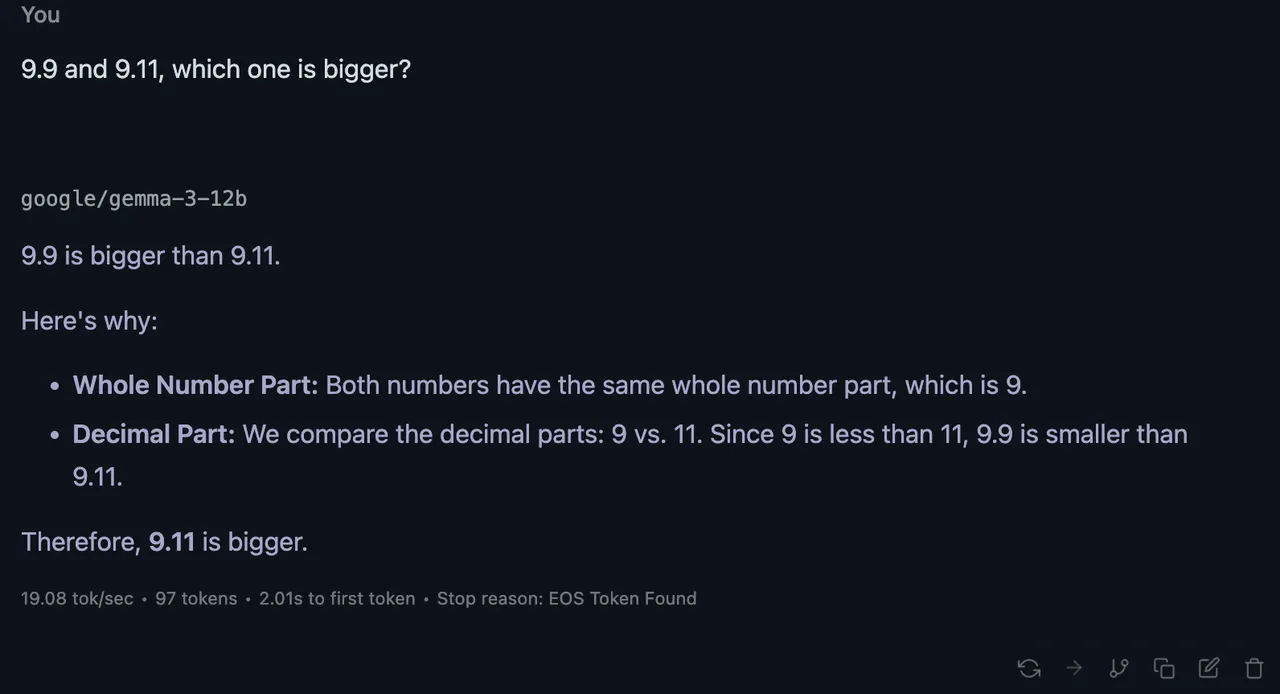 9.9は9.11より大きいで!理由説明したるわ!9より11の方が大きいからや!以上から9.11は9.9より大きいで!