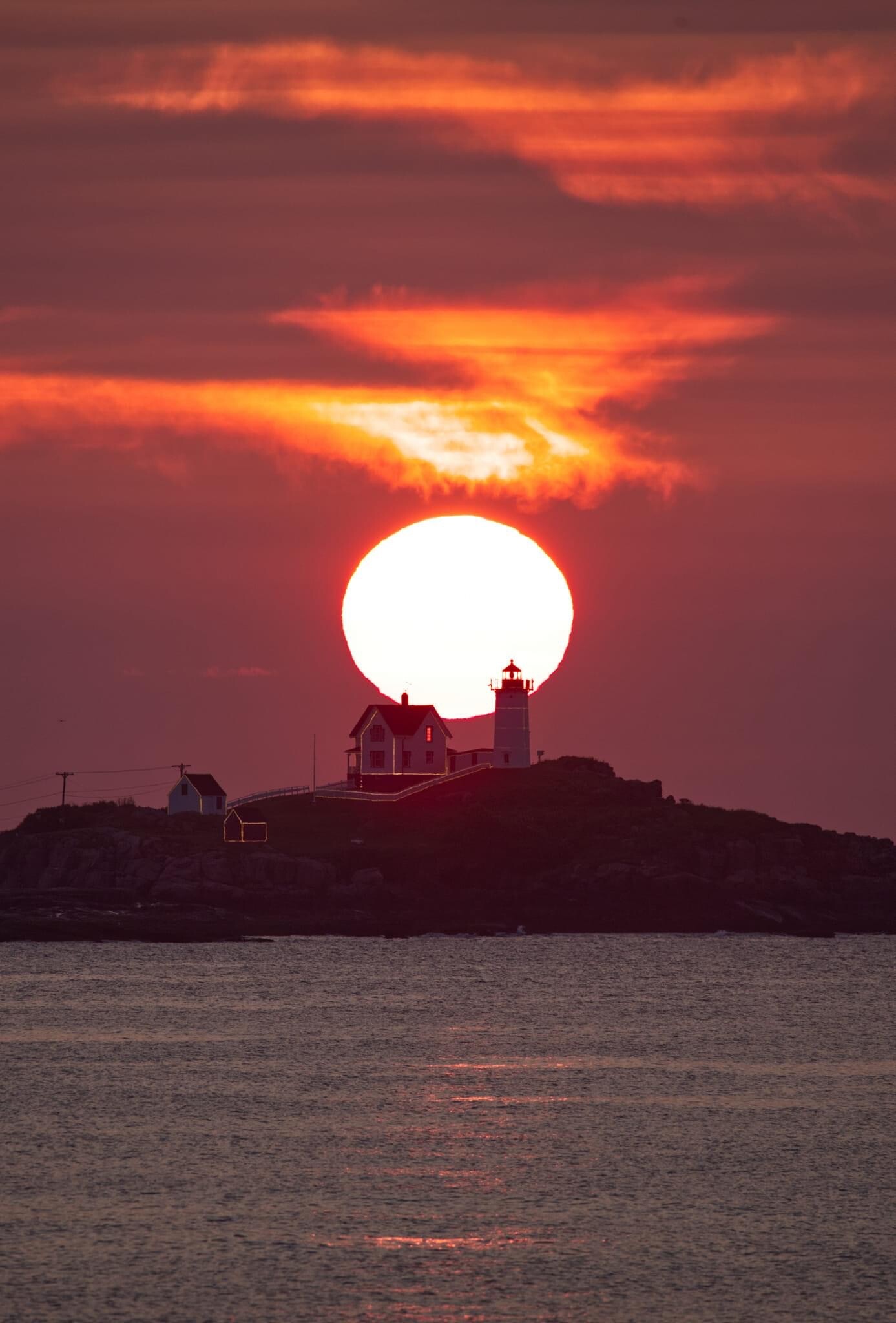 Nubble Lighthouse from Long Sands at York, Maine, at sunrise, 3 August, 2023. Photo by John Burke.