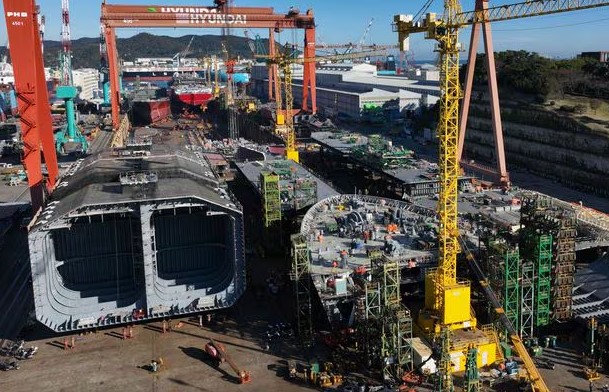 据悉,按季度计算韩国造船业时隔三年击败中国夺回船舶订单第一宝座。其中LNG船、氨燃料船等环保、高附加值船舶订单100%由韩国造船企业拿下。以手持船舶订单为基准,韩国三家造船厂HD现代重工业、三星重工业、韩华海洋分列世界前三。