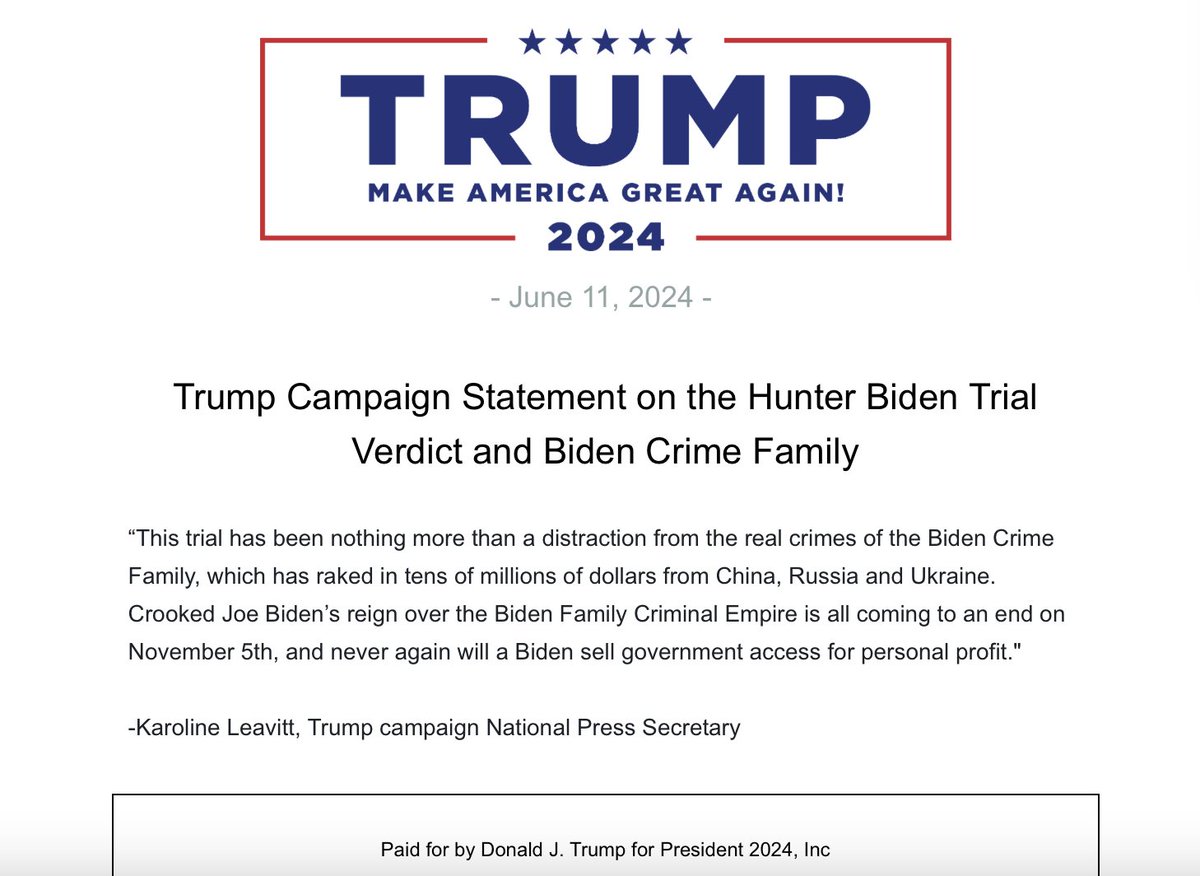 NEW: Statement from the Trump campaign on the conviction of Hunter Biden https://t.co/op7DI204oS