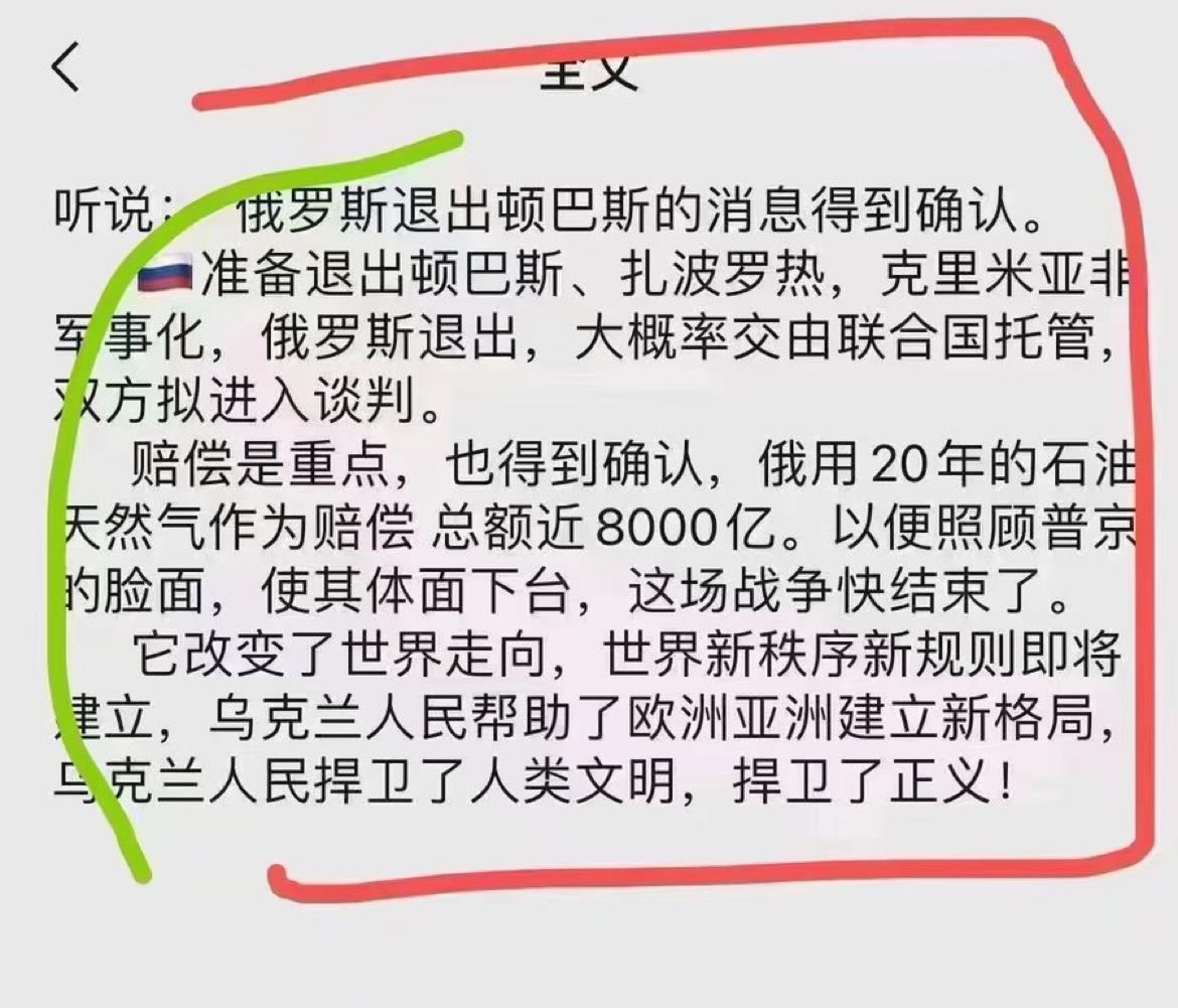 据说俄乌战争即将结束,俄罗斯以20年的石油天然气的收入作为赔偿。退出顿巴斯,扎波罗热地区,克里米亚由联合国托管。老铁们,你们认为如果真是这样,中共国将会怎么样? https://t.co/T1Ce0qcMvj
