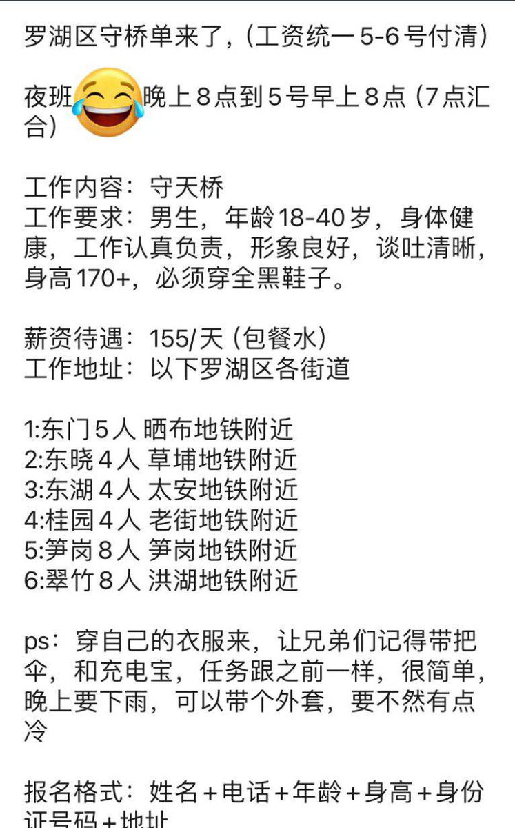 深圳羅湖區,臨時招募6月4日晚上的守橋員。155一天,包餐水。 https://t.co/rXKsIm06d3