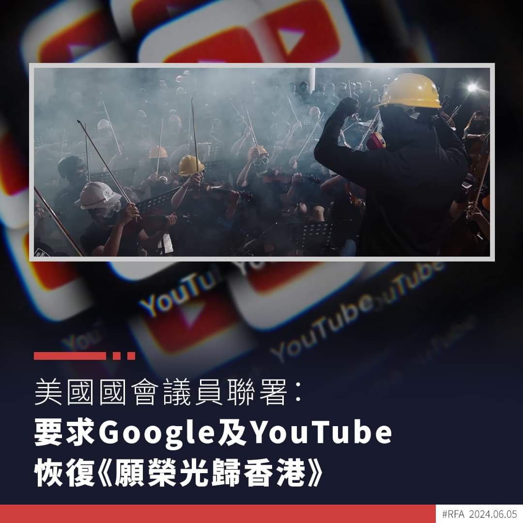 美國國會及行政當局中國委員會(CECC)主席、共和黨籍眾議員史密斯(Chris Smith)及共同主席、民主黨籍參議員默克利(Jeff Merkley) ,在6月5日聯合致函Google及YouTube執行長,呼籲在YouTube平台上為用戶恢復《願榮光歸香港》一曲,並敦促Google公佈對香港法院提上訴的計劃,指該裁決違反了這些公司承諾維護國際人權原則。