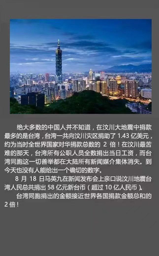 絕大多數的中國人並不知道,在汶川大地震中捐款最多的是台灣,台灣一共向汶川災區捐了1.43億美元,約為當時全世界國家對華捐款總數的2倍! 台灣所有公職人員全數捐出當日工資,而台灣同胞這一切善舉都在大陸所有新聞媒介集體消失。 到今天也沒有人能給出一個確切的數字…