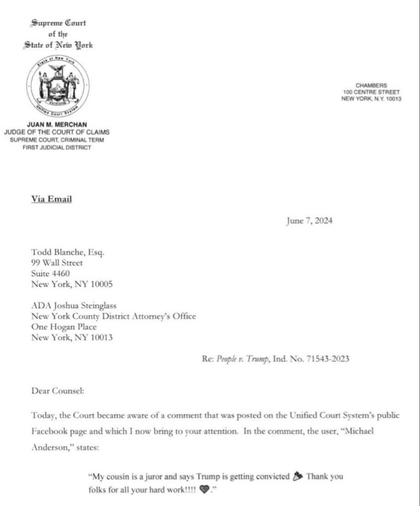 法官剛剛發電郵通知控辯雙方,一名懷疑是案中陪審團表兄弟的人,在陪審團裁決前一晚,在Facebook預告翌日特朗普將被定罪並表示要慶祝。 https://t.co/eqWtKqJPHW
