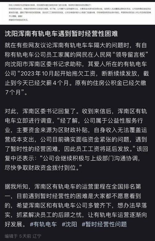 沈阳浑南区有轨电车公司自2023年10月起开始拖欠工资,断断续续发放,截至6月已欠薪4个月,住房公积金欠缴7个月。