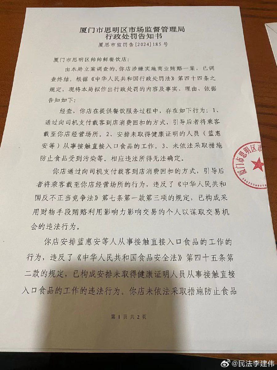 7月14日,中国政法大学教授李建伟曝料:一家海鲜餐饮店为了招揽更多的客人,和周边司机达成约定,如果司机将乘客载至该店吃饭,就支付司机5-20元的奖励。结果此举被厦门思明区市场监督管理局罚款100万元。