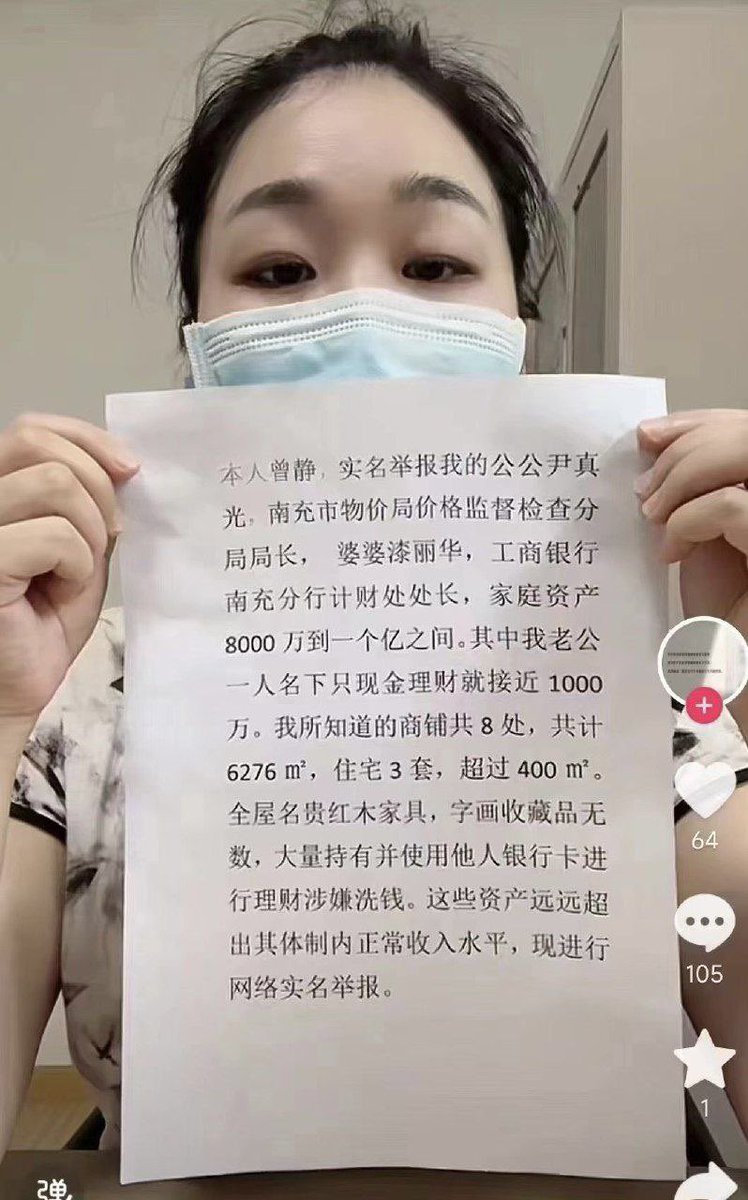 近日,四川南充一女子发视频实名举报称,自己公婆名下有巨额不明财产,引发社会关注。该女子称,她的公公是南充事务局价格监督检查分局局长,婆婆是工商银行南充分行计财处处长,两人名下资产近亿元,其中有8套商铺,3套住宅。 https://t.co/zVi2eZOeZP