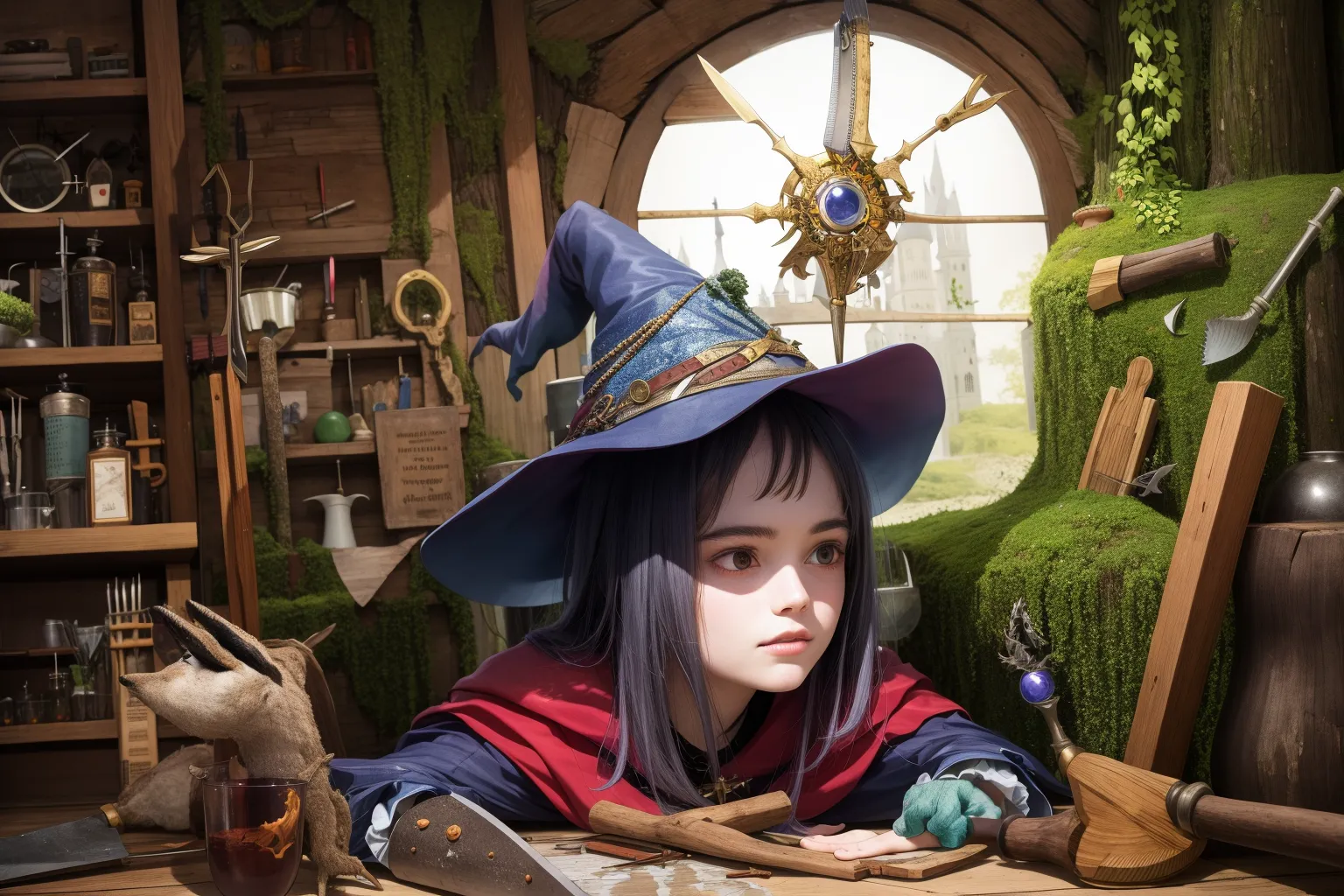 #majinai #masterpiece #best #quality #illustration #realistic #1girl #solo #western #old #school #beautiful #girl #beautiful #face #loli #10 #years #old #witch #hat #The #Witch #Laboratory #Laboratory #full #of #witch #tools #fantasy #magical #full #color #magical #dynamic #House #made #from #hollowed #out #wood #Moss #indoor #Medieval #Europe #injured #soldier