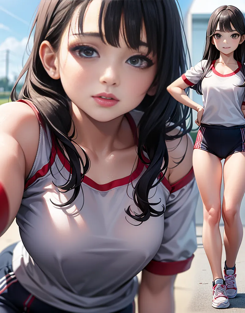 #majinai #hyper #extreme #detailed #masterpiece #intricate #realistic #best #quality #detailed #high #face #detail #detailed #Photorealistic #gym #1girl #full_body #stretching #sunlight #windy #black_hair #medium #hair #wavy_hair #blunt #bangs #small #breasts #collarbone #thighs #sweating #off #shoulder #hair_tucking #loli #age #12 #gym_uniform #cute_face #sneakers