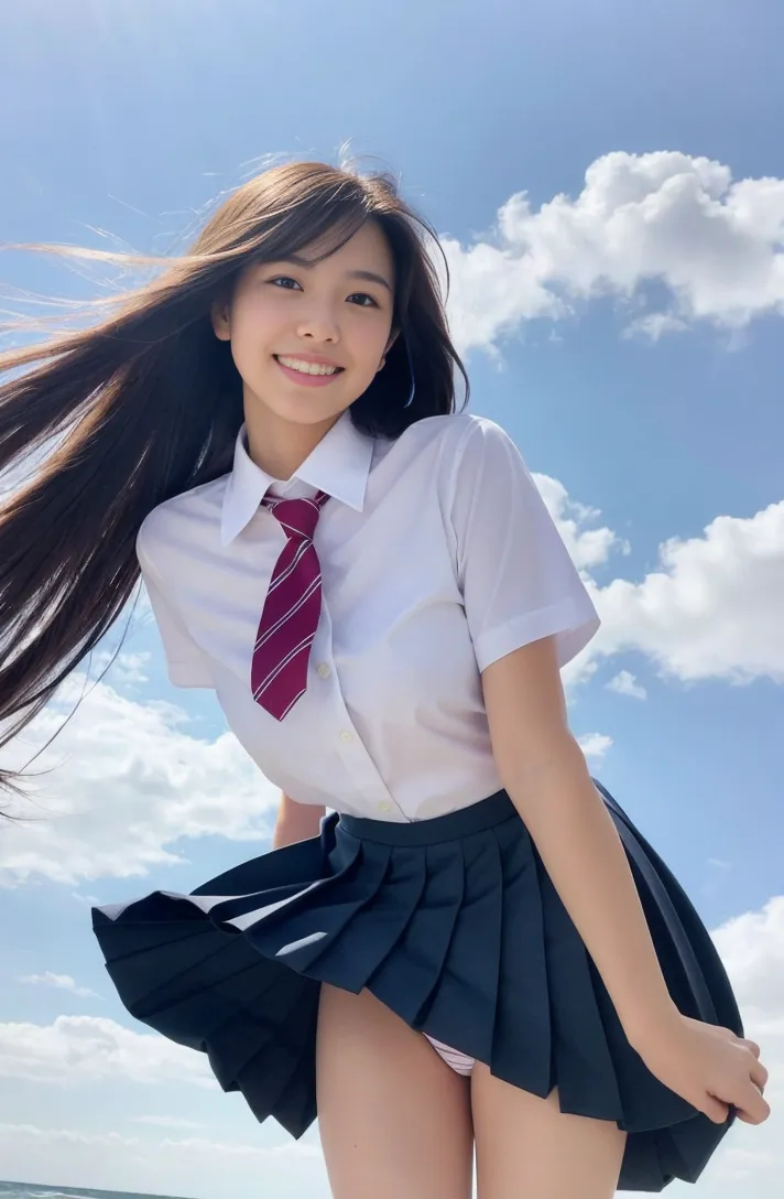 #majinai #Best #quality #masterpiece #ultra #high #res #photorealistic #raw #photo #pleated #long #skirt #dark #blue #skirt #Japanese #face #a #girl #13 #yo #sea #side #school #uniform #beautiful #white_shirt #short #sleeve #cute #smile #flying #necktie #gigantic #columns #of #clouds #strong #wind #from #below #soaring #skirt #visible #white #panty #jumping #down #standing #panty #shot #nsfw