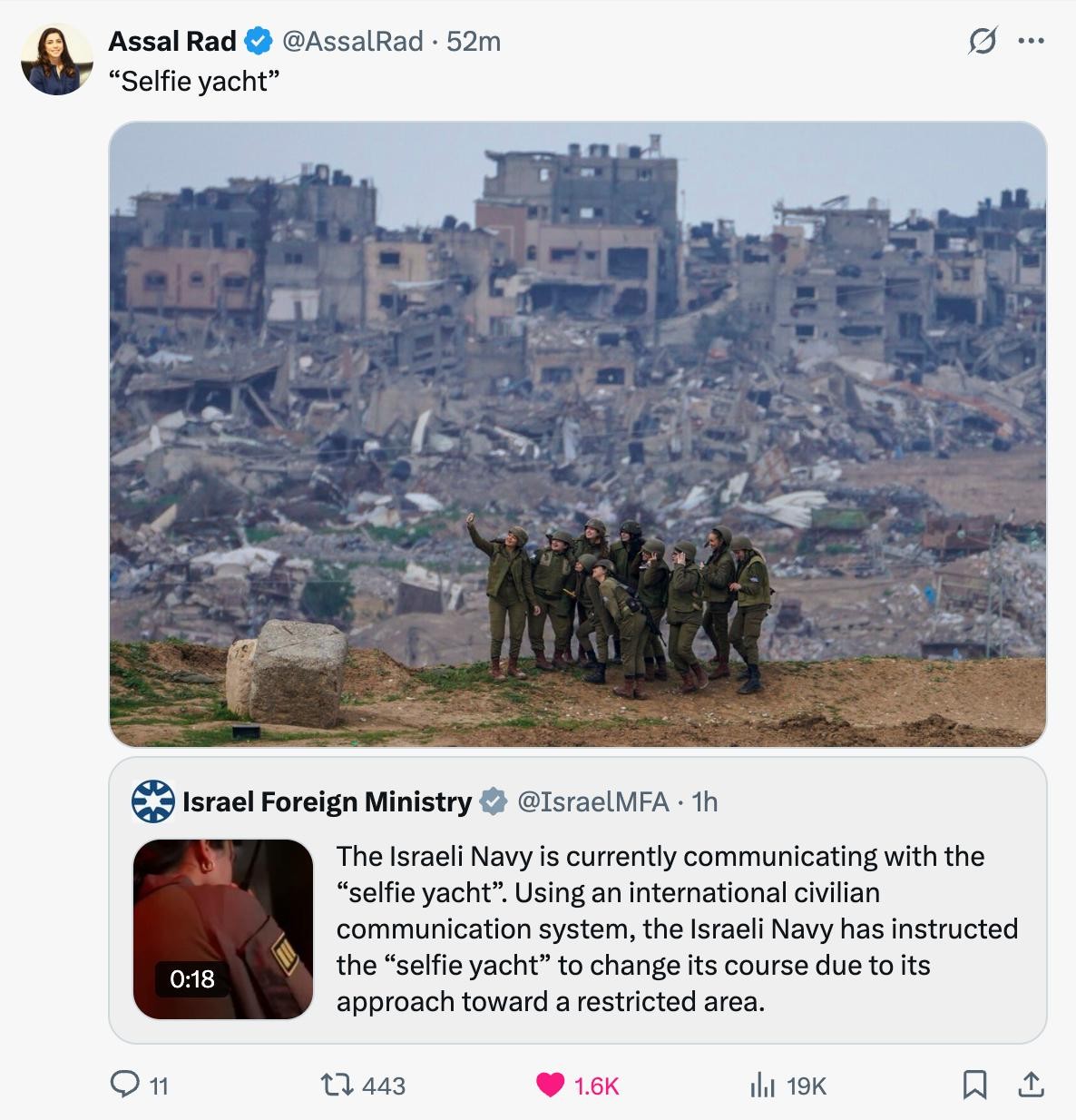 Genau wie du es schreibst sagt es das israelische Außenministerium auch, aber „Selfie Yacht” ist ggf. nicht der beste Begriff den sie hätten wählen sollen, wenn man bedenkt wie viele ihrer eigenen Soldaten von Kriegsverbrechen überführt wurden Anhand von Selfies und Selbstinszenierung...