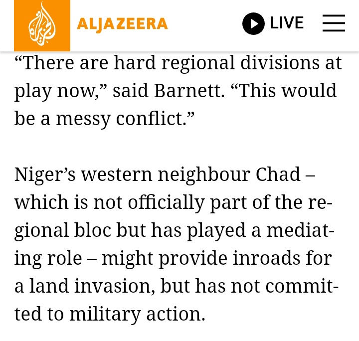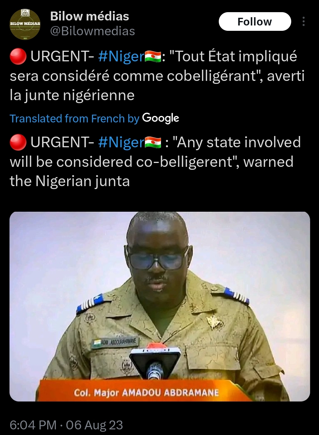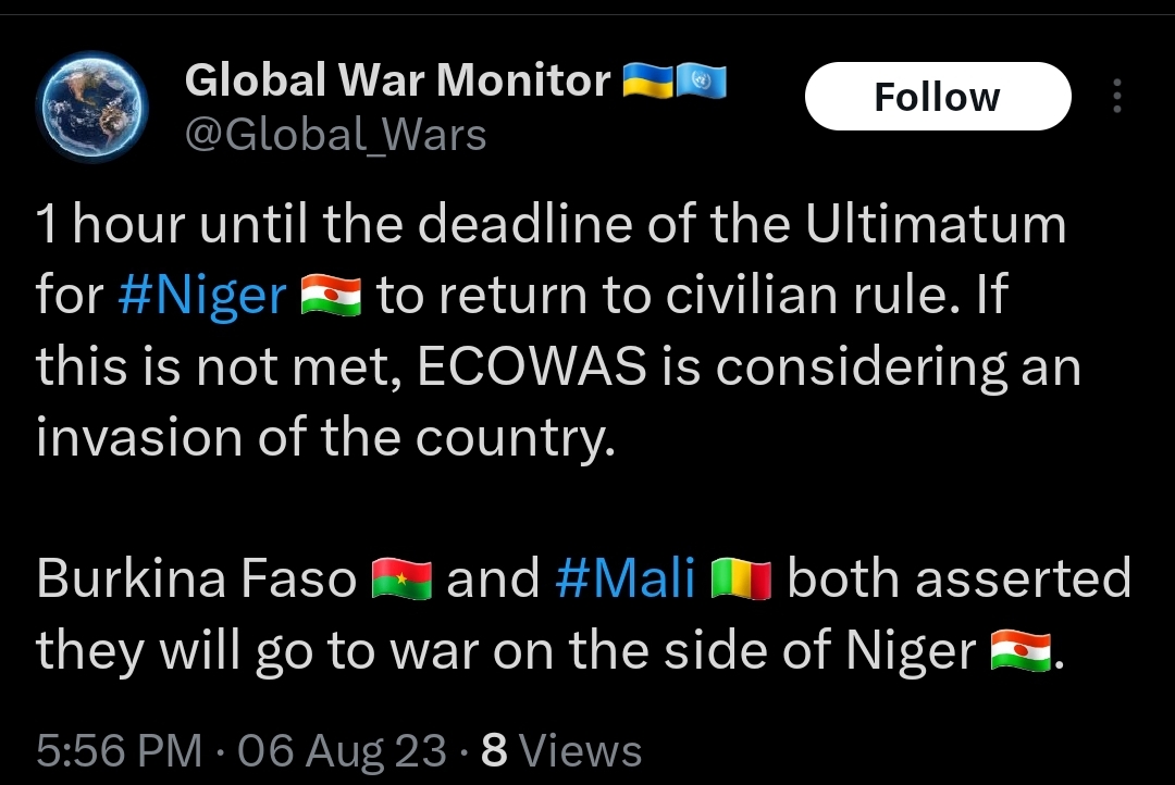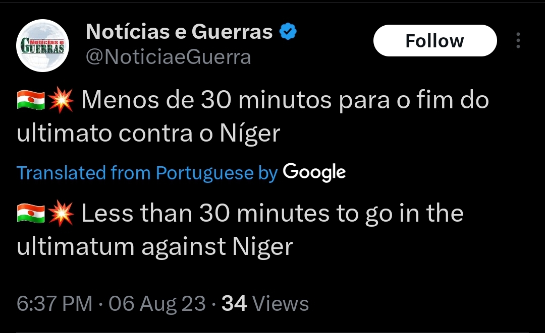 For whatever it's worth, there's 30mins left in the ultimatum that was given to Niger, so I guess we'll see what happens tonight.