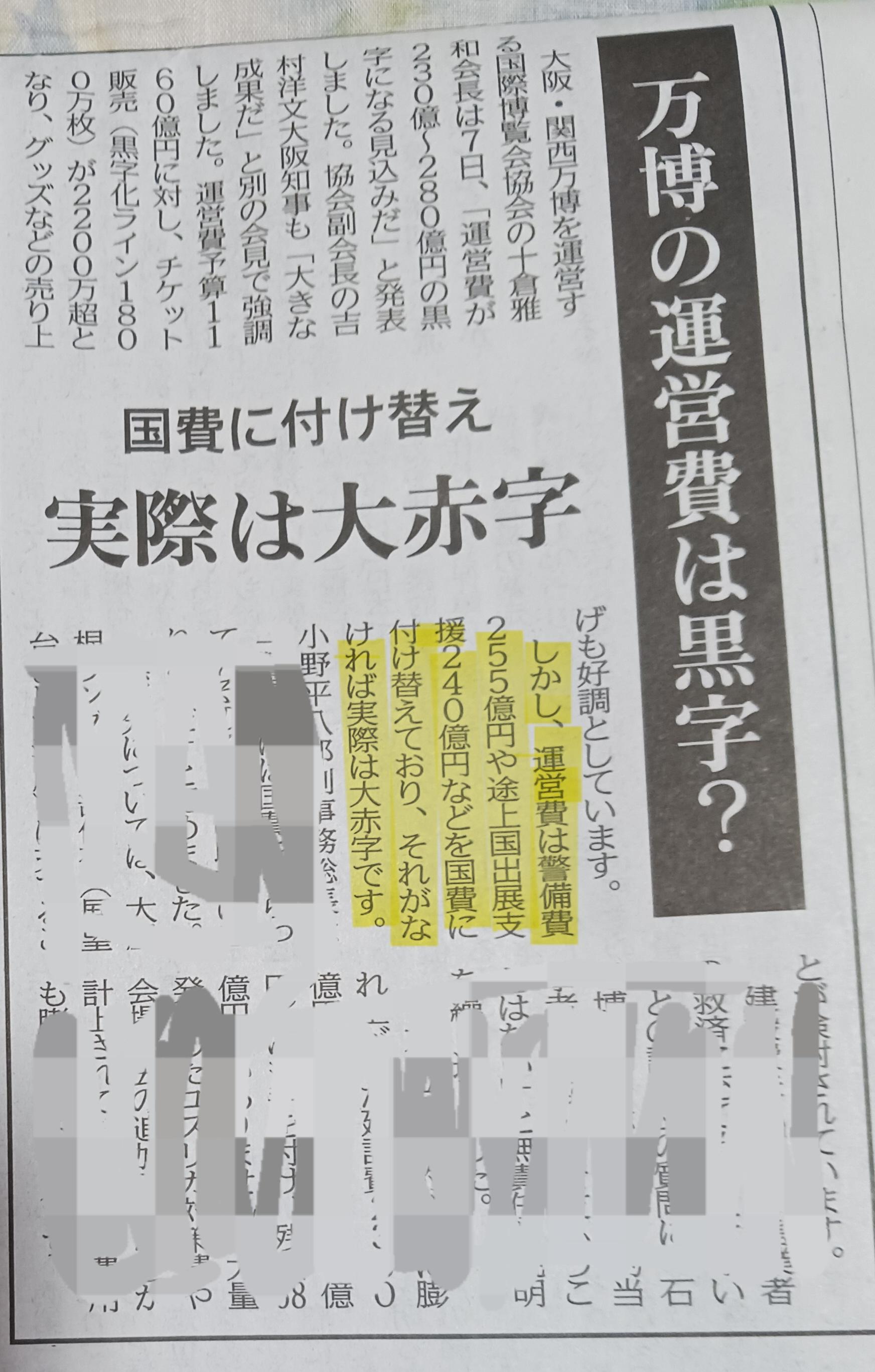 メディアは万博協会が報じた「万博は280億円の黒字」とそのまま垂れ流ししているが、黒字はウソ。国費を含めているから。