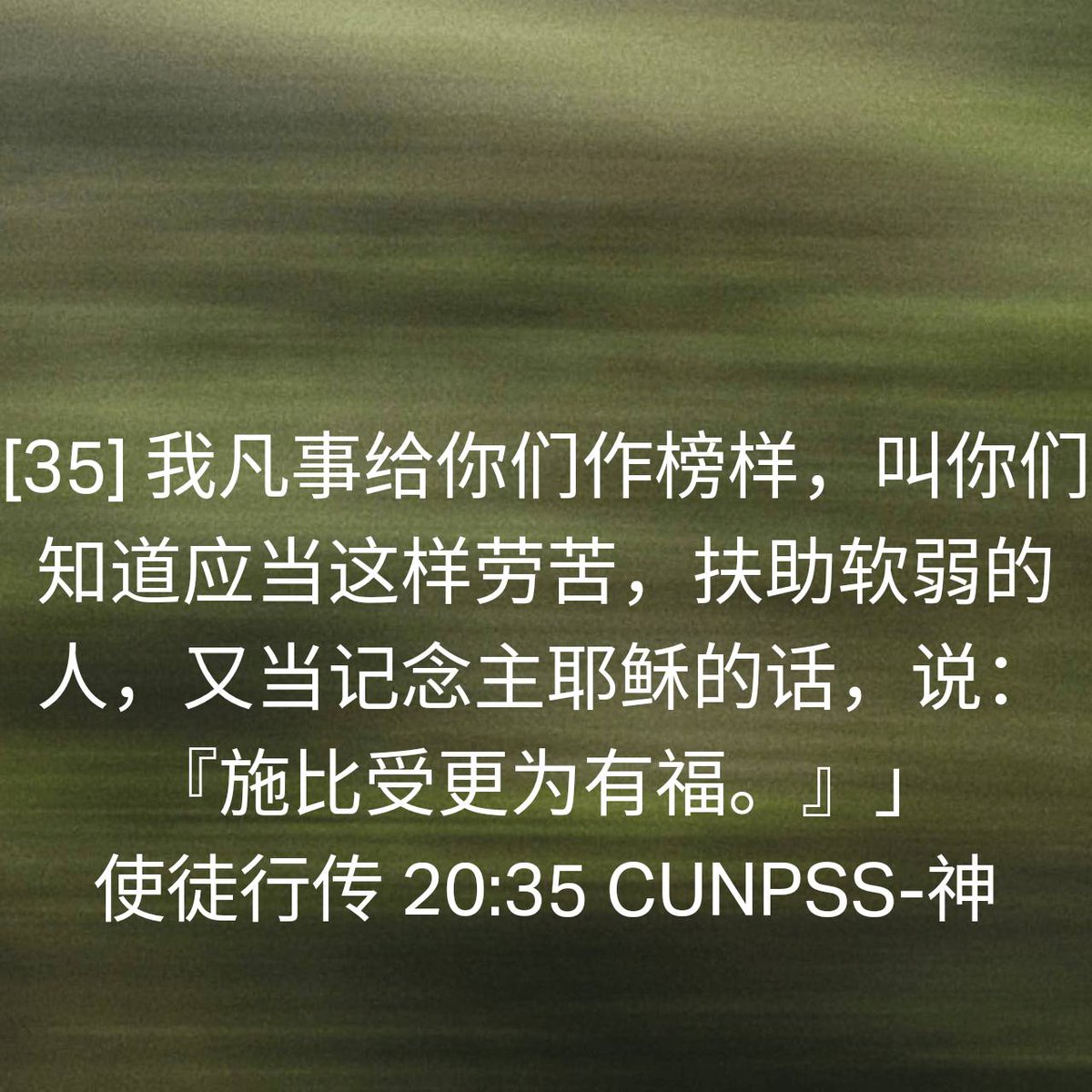 [35] 我凡事给你们作榜样,叫你们知道应当这样劳苦,扶助软弱的人,又当记念主耶稣的话,说:『施比受更为有福。』」