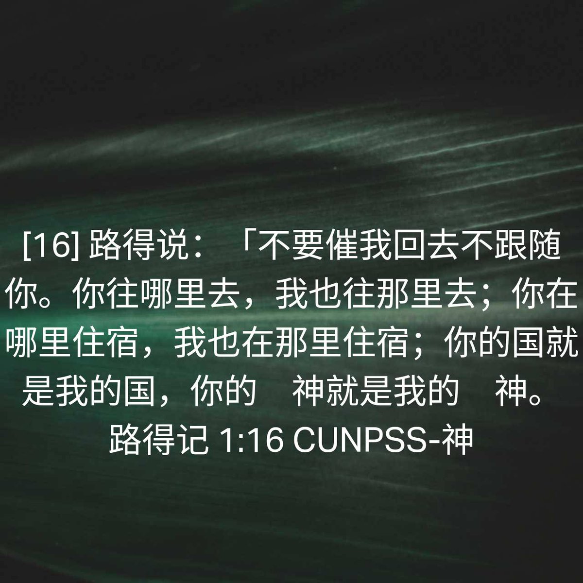 [16] 路得说:「不要催我回去不跟随你。你往哪里去,我也往那里去;你在哪里住宿,我也在那里住宿;你的国就是我的国,你的 神就是我的 神。